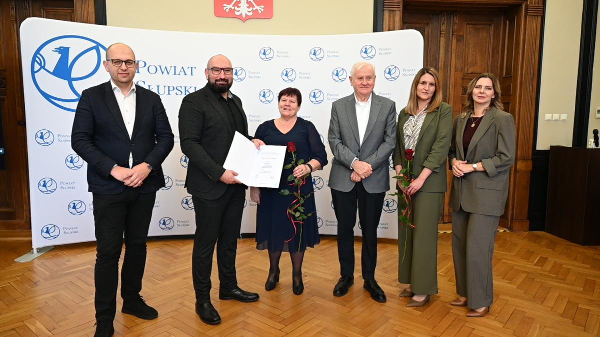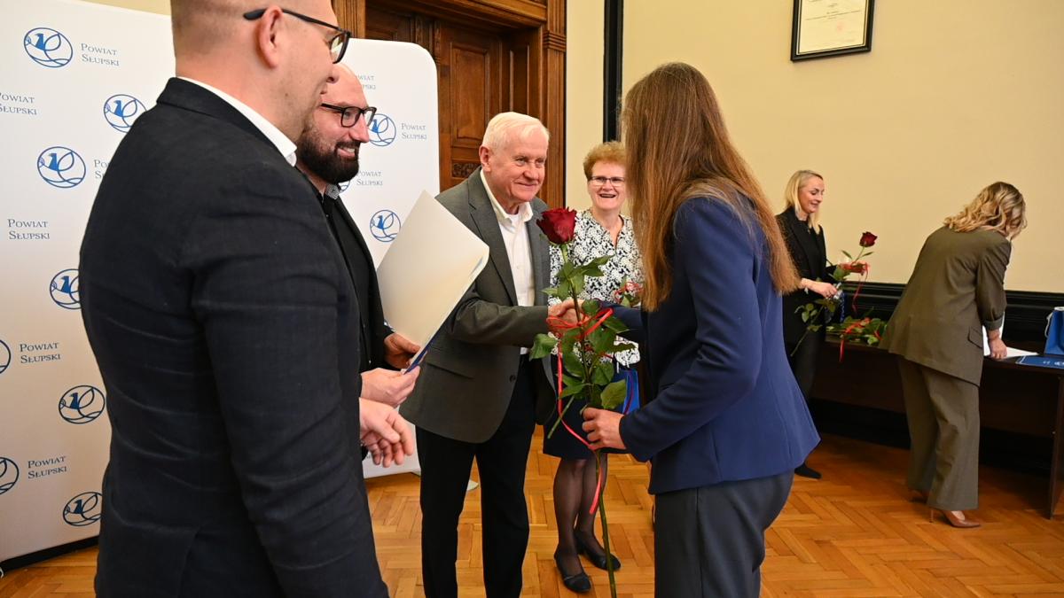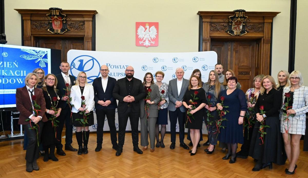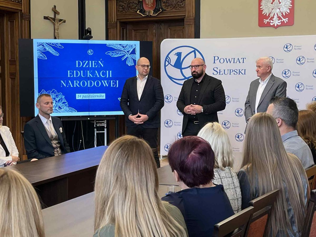 Z okazji Dnia Edukacji Narodowej starosta Paweł Lisowski wraz z wicestarostą Marcinem Kowalczykiem, członkiem Zarządu Powiatu Słupskiego Wiesławem Kamińskim i dyrektor Centrum Usług Wspólnych Powiatu Słupskiego Anettą Pirką wręczyli dyrektorom i nauczycielom pracującym w szkołach i placówkach oświatowych prowadzonych przez samorząd Powiatu Słupskiego nagrody za szczególne osiągnięcia w pracy dydaktyczno-wychowawczej z dziećmi i młodzieżą z terenu powiatu. Spotkanie było okazją do złożenia podziękowań za codzienny trud, pasję i zaangażowanie w wychowanie oraz kształcenie młodego pokolenia.