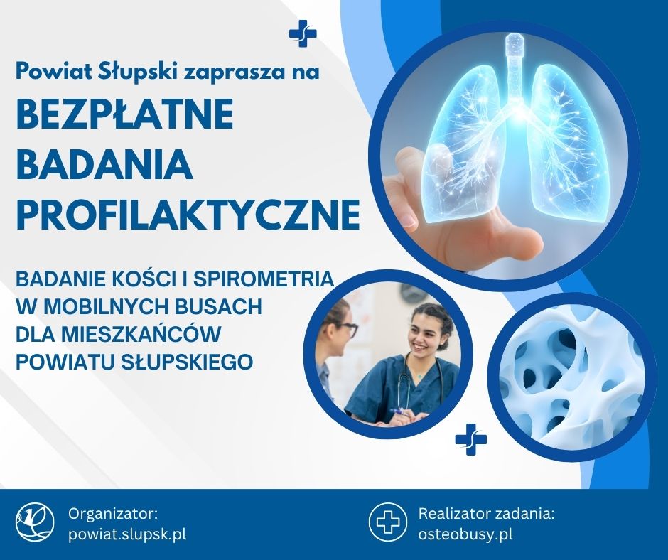 Od 1 grudnia rusza akcja profilaktyczna mającą na celu przebadać 500 mieszkańców powiatu pod kątem osteoporozy i chorób płuc. Akcja potrwa do 12 grudnia, a diagnostyka będzie wykonywana w specjalnie przystosowanych do tego busach. Wystarczy, że dokonacie wcześniejszej rejestracji telefonicznej pod wskazanym numerem telefonu w Waszej gminie i w konkretnym terminie zgłosicie się na badanie.