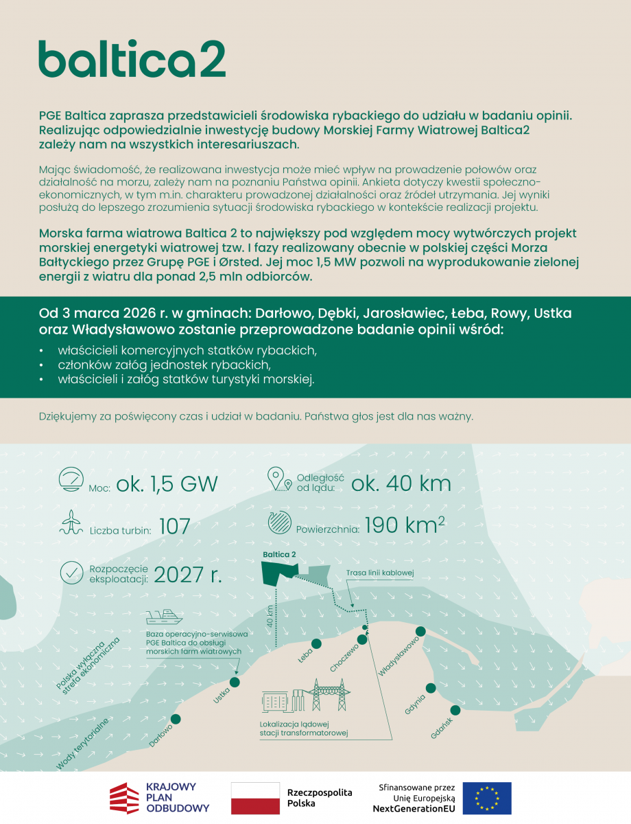 Mając świadomość, że realizowana inwestycja może mieć wpływ na prowadzenie połowów oraz działalność na morzu, zależy nam na poznaniu Państwa opinii. Ankieta dotyczy kwestii społecznoekonomicznych, w tym m.in. charakteru prowadzonej działalności oraz źródeł utrzymania. Jej wyniki posłużą do lepszego zrozumienia sytuacji środowiska rybackiego w kontekście realizacji projektu.
